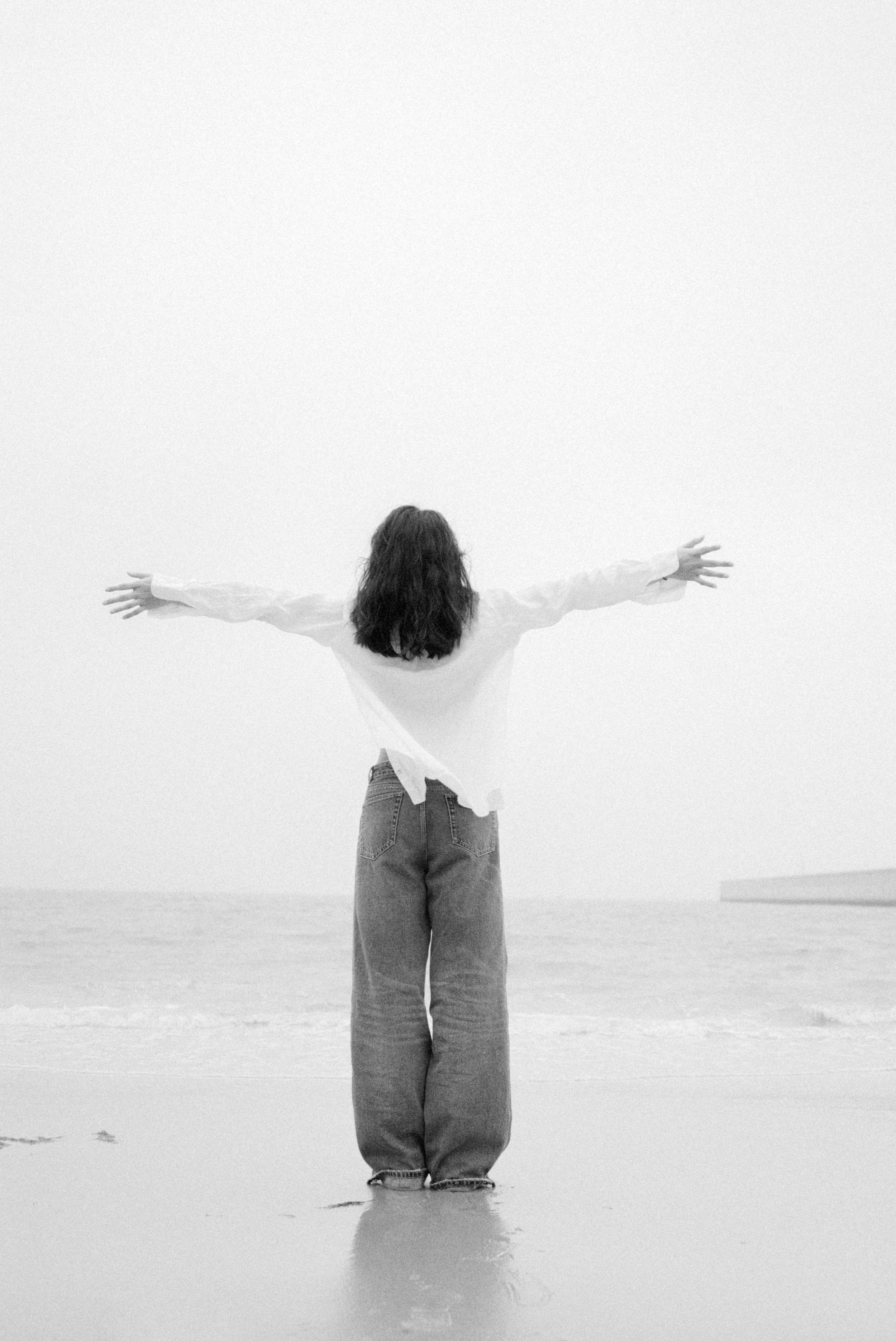 A figure stands alone at the water's edge, back to the viewer, facing the open expanse of sea. Their arms are outstretched wide, fingers spread and reaching, as though receiving something from the horizon or offering something to it — the gesture sits beautifully between surrender and embrace.